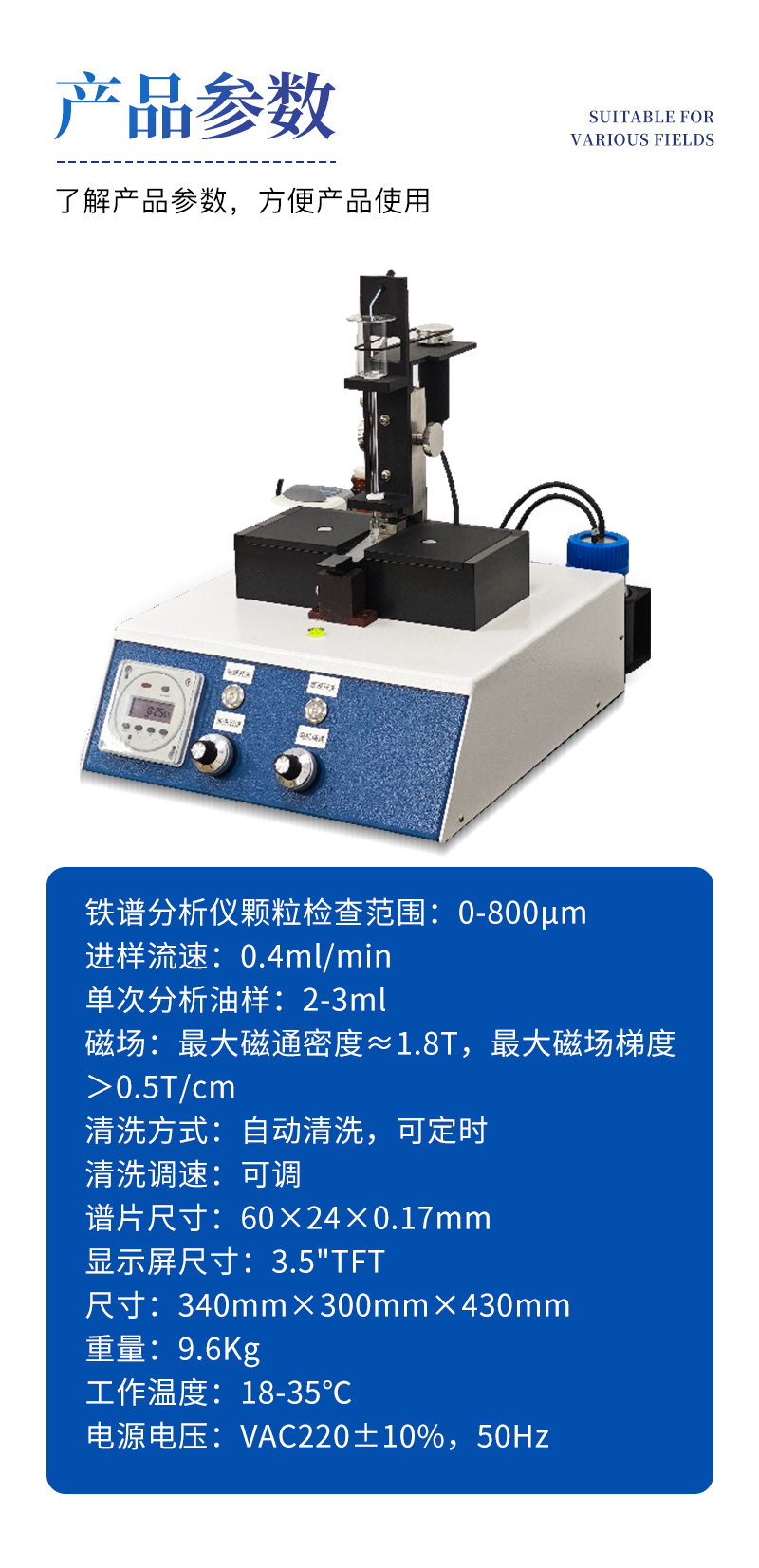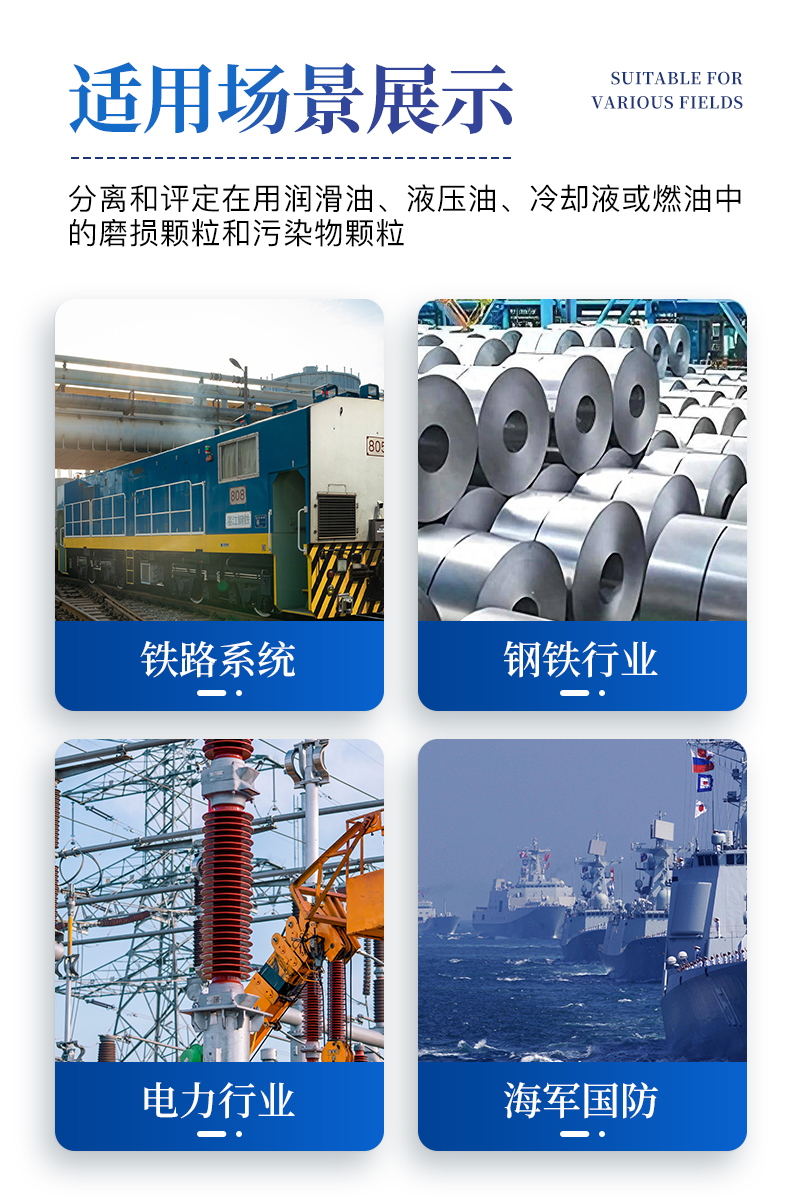 ?。?4)應(yīng)用范圍:用以分離和評(píng)定在用潤滑油、液壓油、冷卻液或燃油中的磨損顆粒和污染物顆粒;