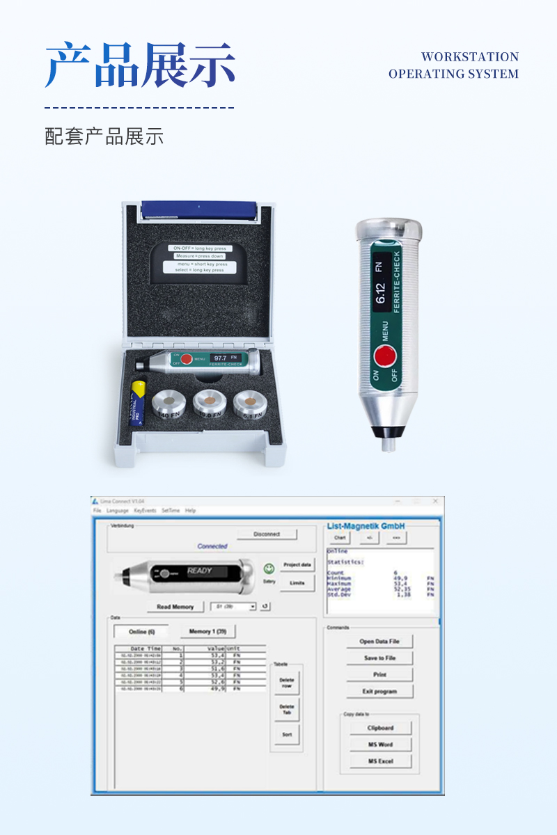 為了進一步處理測量數(shù)據(jù),您可以將FERRITE-CHECK 140鐵素體含量檢測儀與移動Android和iOS設(shè)備配對?;蛘吲c一臺Windows電腦通信。這是由低功耗藍牙技術(shù)(BLE)實現(xiàn)的。使用Lima Connect應(yīng)用程序,您可以管理項目并在照片上分配測量點。測量結(jié)果可以統(tǒng)計評估和圖形顯示。這款應(yīng)用適用于安卓、iOS和Windows系統(tǒng),軟件免費的。