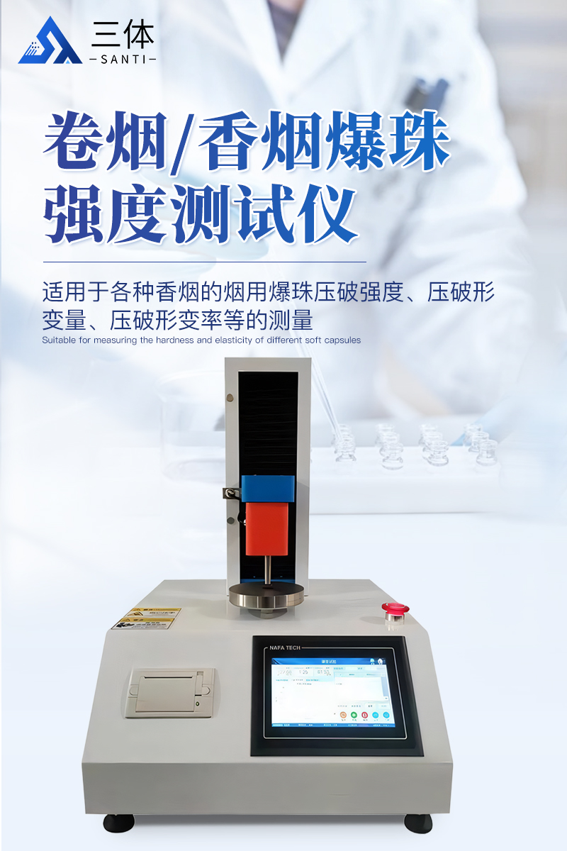 香煙爆珠強度測試儀適用于各種香煙的煙用爆珠壓破強度、壓破形變量、壓破形變率等的測量,為選擇產品的配方和工藝提供參考數(shù)據,該機也叫煙用爆珠壓破強度測試儀, 爆珠強度測量儀,香煙膠囊爆珠顆粒壓力形變檢測儀,香丸爆珠強度測試儀,香煙爆珠脆性膠囊強度測試儀等香煙爆珠(Filter Capsule)是指嵌在煙草過濾嘴內的一顆