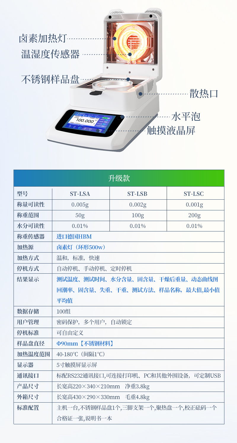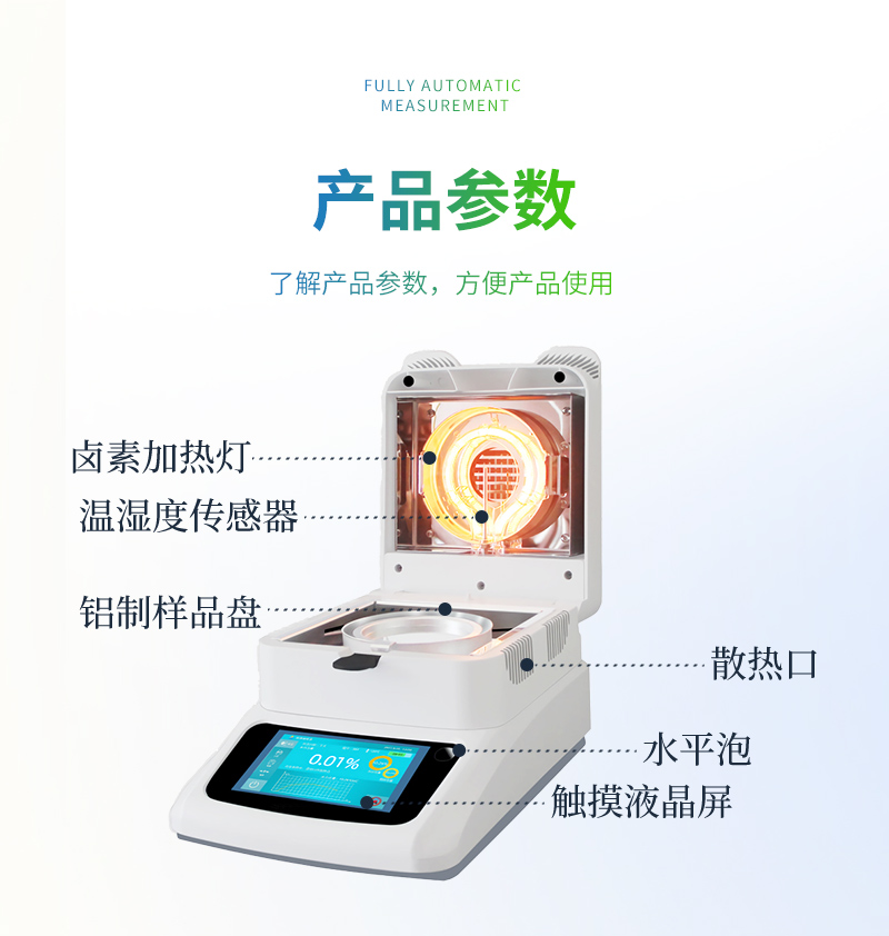 該系列快速水分測定儀應(yīng)用了國際烘箱干燥法原理,測定結(jié)果與烘箱法水分測定具有良好的一致性,工作效率卻遠(yuǎn)遠(yuǎn)高于烘箱法水分測定,一般樣品只需要幾分鐘即可測量完畢,因此受到廣大用戶的青睞與好評。
