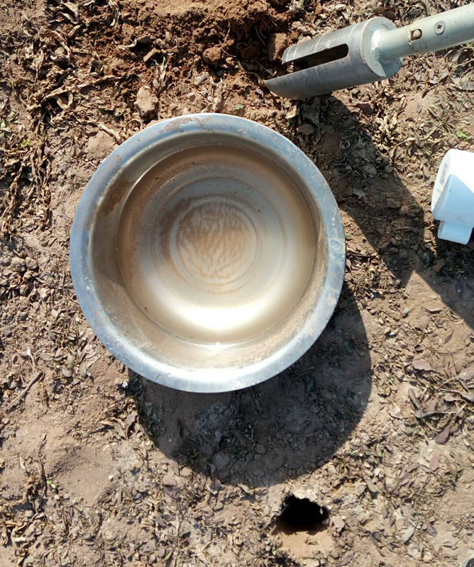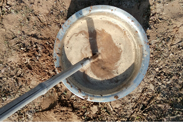 b. 將取土鉆從孔洞中取出,放到盆子里,用工具把鉆出的土收集到盆子里以用來和泥漿。(注意:初次鉆土因?yàn)殡s質(zhì)過多,不做收集)