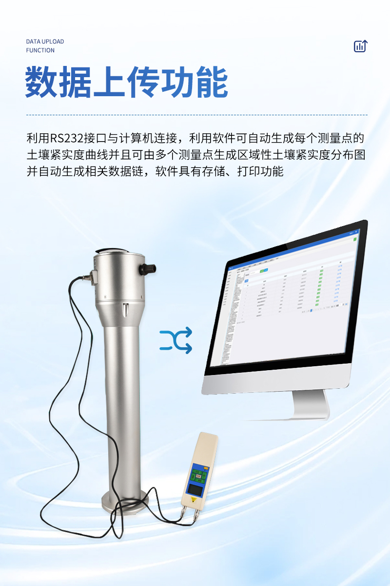 具有數(shù)據(jù)上傳功能:利用RS232接口與計算機(jī)連接,利用軟件可自動生成每個測量點(diǎn)的土壤緊實度曲線并且可由多個測量點(diǎn)生成區(qū)域性土壤緊實度分布圖并自動生成相關(guān)數(shù)據(jù)鏈。軟件具有存儲、打印功能。