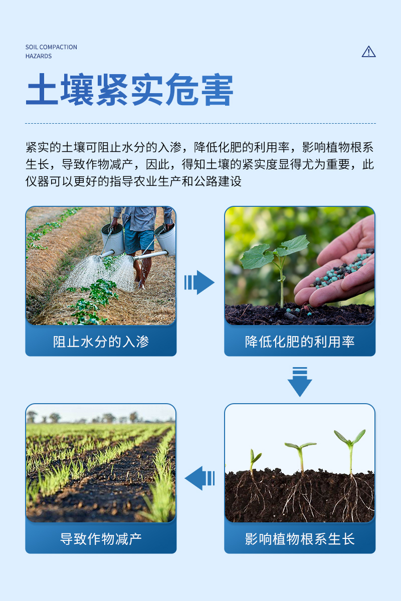 緊實的土壤可阻止水分的入滲,降低化肥的利用率,影響植物根系生長,導(dǎo)致作物減產(chǎn)。因此,得知土壤的緊實度顯得尤為重要,此儀器可以更好的指導(dǎo)農(nóng)業(yè)生產(chǎn)和公路建設(shè)。